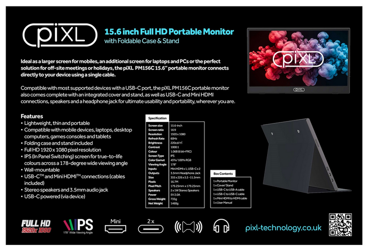 15.6 Inch 60Hz Full HD (1920 x 1080) IPS Widescreen Portable Monitor with USB-C (Included) Mini HDMI (Included) Speakers Foldable Case & Stand