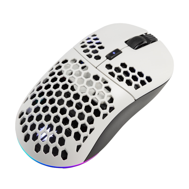 Lightweight RGB Wireless Gaming Mouse with Interchangeable Black & White Honeycomb Shells included.